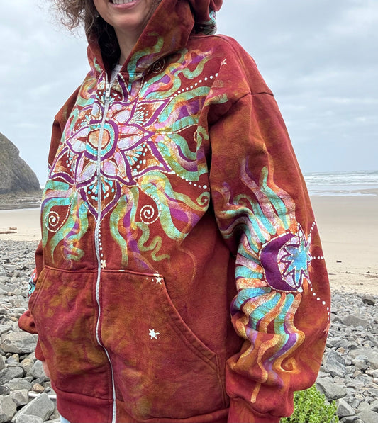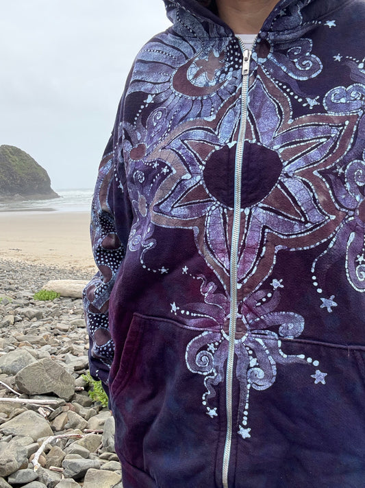 Gold Rush Star with Purple Moon – Handmade Batik Zipper Hoodie (Women’s M/L Fit)