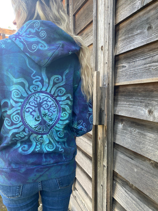 Teal and Purple Tree of Life Handcrafted Batik Zipper Hoodie - Unisex Size 2X, Unisex Size Large