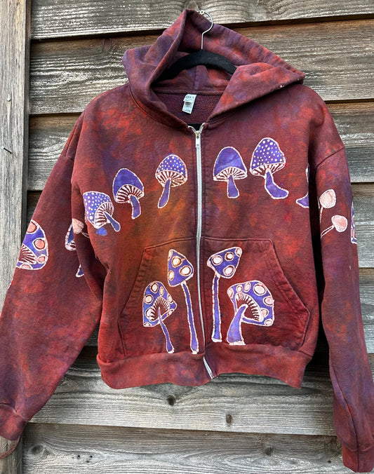 Purple Woodland Mushroom Hunter Handmade Batik Hoodie - 2X Unisex
