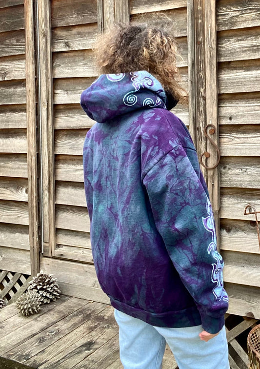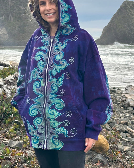 Teal and Purple Tuxedo Swirls with Stars Handcrafted Batik Zipper Hoodie - Large