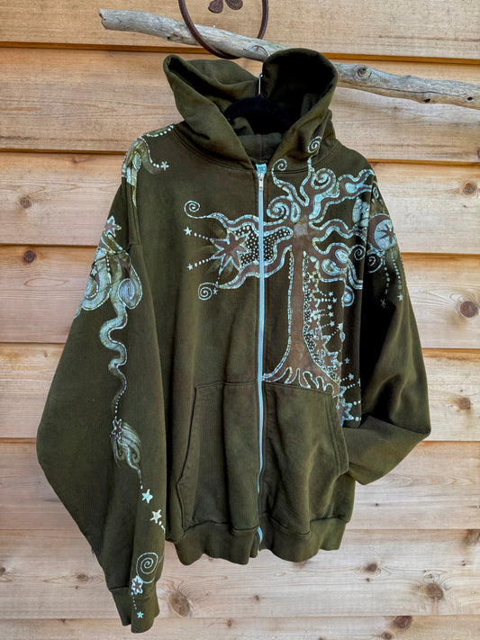 Forest Owl Tree of Life – Handcrafted Batik Zipper Hoodie - Size 2X
