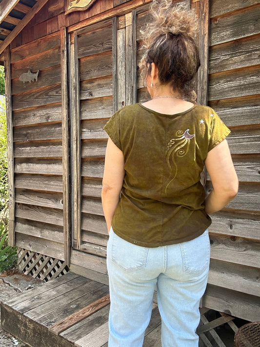 Tree of Life in Camo Green Handmade Batik Scoop Neck Top - Size Small ONLY