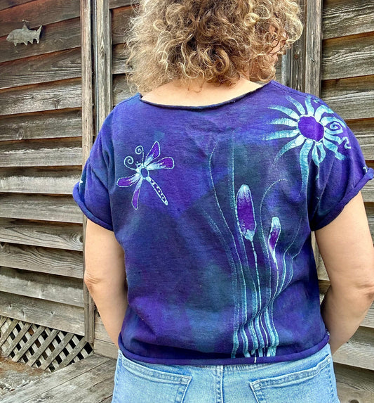 Dragonfly and Cattails Batik Cotton Cropped Tee