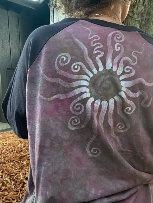 Plumberry Sage Moon & Stars Batik Tee – ¾ Sleeve Artist Shirt in Plum & Green