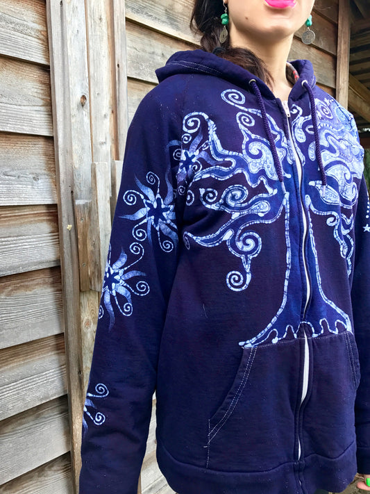 Deep Blue Midnight Moon Tree Organic Batik Hoodie