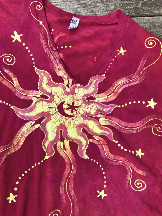 Moonbeams in Campfire Red - Hand Crafted Batik Vneck Tee