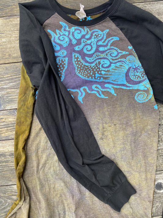 Odd Turquoise Tree Black Raglan Long Sleeve Batik Top by Batikwalla - Size Large