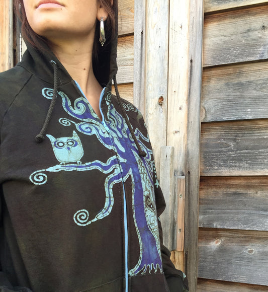 Olive Green Owl Sanctuary Handmade Batik Hoodie