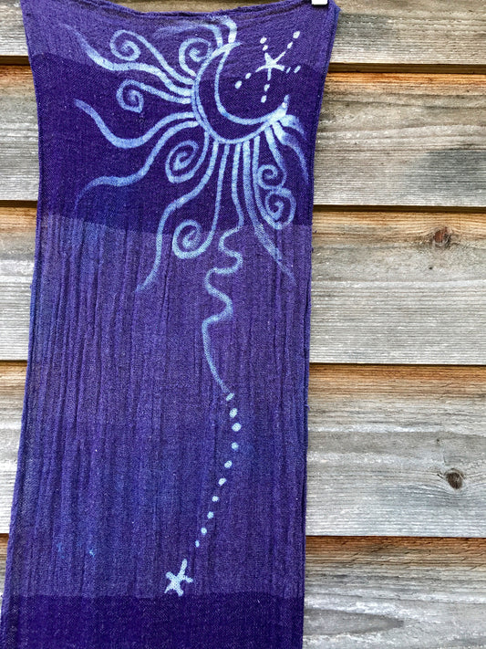 Purple Moon and Stars Handmade Batik Scarf in Organic Cotton - Longer Length