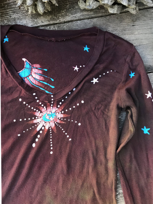 Rust and Turquoise Moonbeams Handmade Batik Scoop Neck Tshirt - Size XL