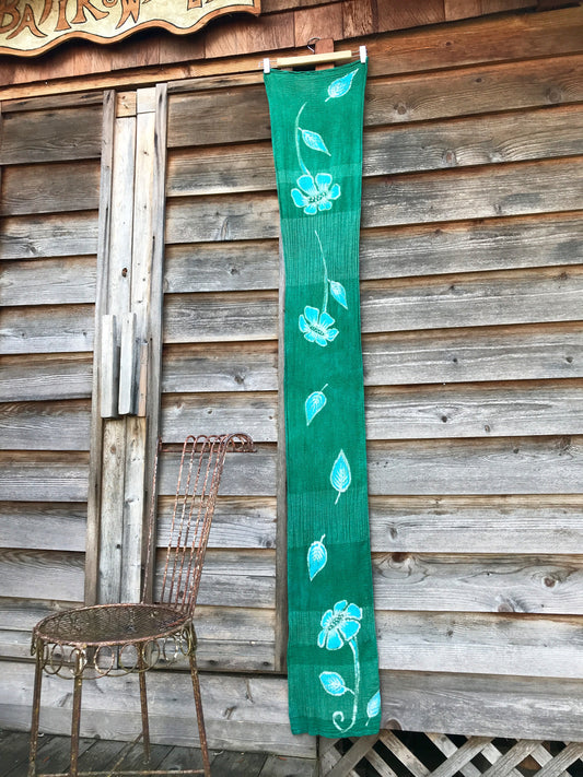 Super Long Spring Green Flower Power Handmade Batik Scarf in Organic Cotton