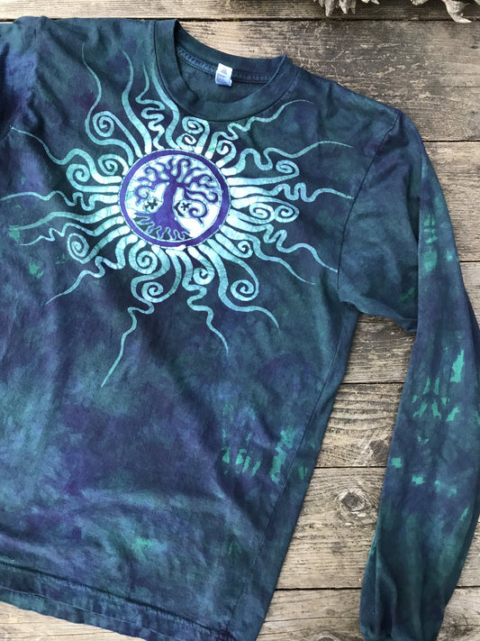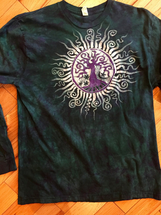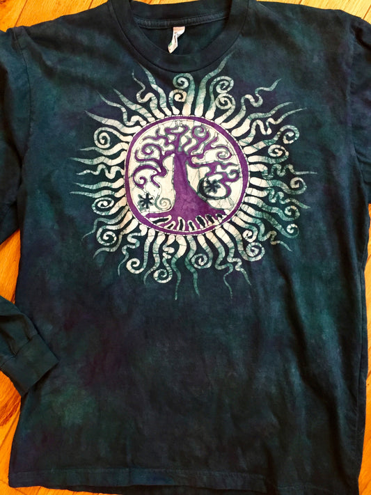 Teal and Purple Tree of Life Long Sleeve Batik Mens Tshirt - Size Large