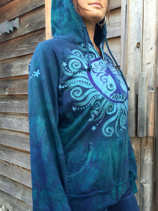 Teal and Purple Tree of Life Handcrafted Batik Zipper Hoodie - Size LARGE