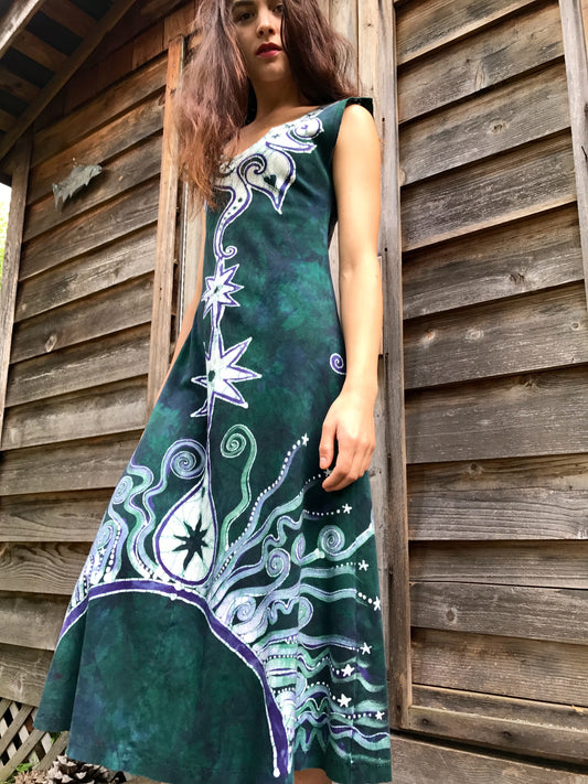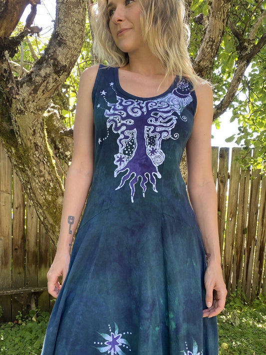 Teal and Purple Tree Loves The Moon Boho Batik Dress