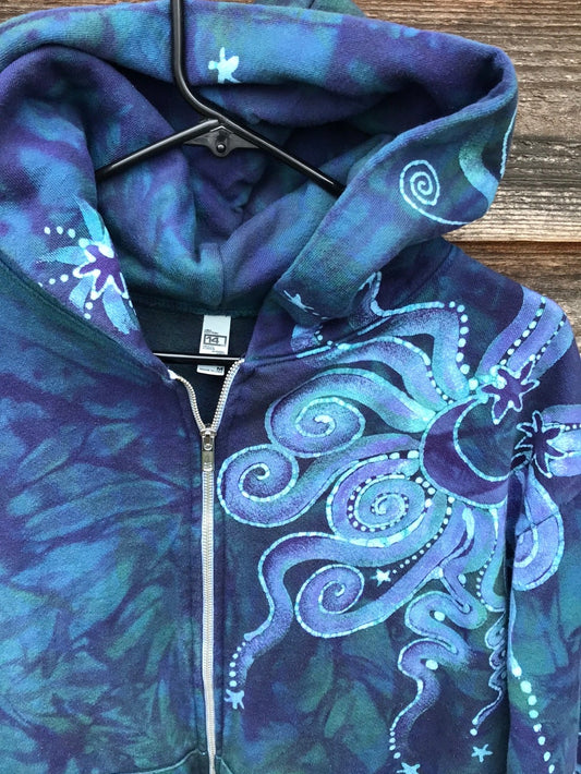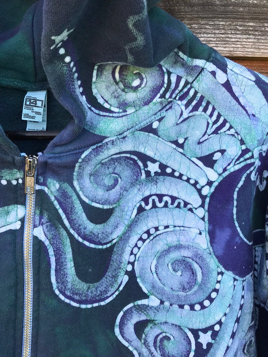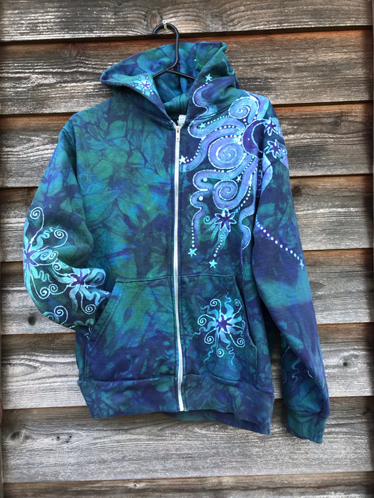 Teal and Purple Tuxedo Swirls Handcrafted Batik Zipper Hoodie - Size XL