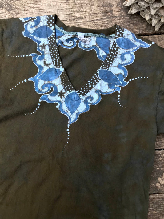 Water Leaf Scrolls - Hand Crafted Batik Vneck Tee Size SMALL Only