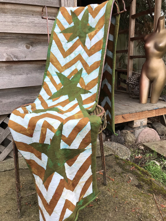 Zigzag Stars Soft Brown & Green - Thick Organic Cotton Fleece Hand Painted Scarf