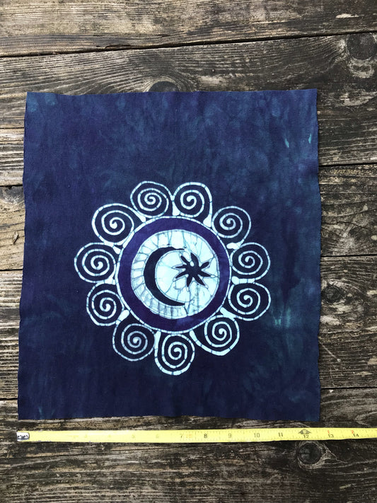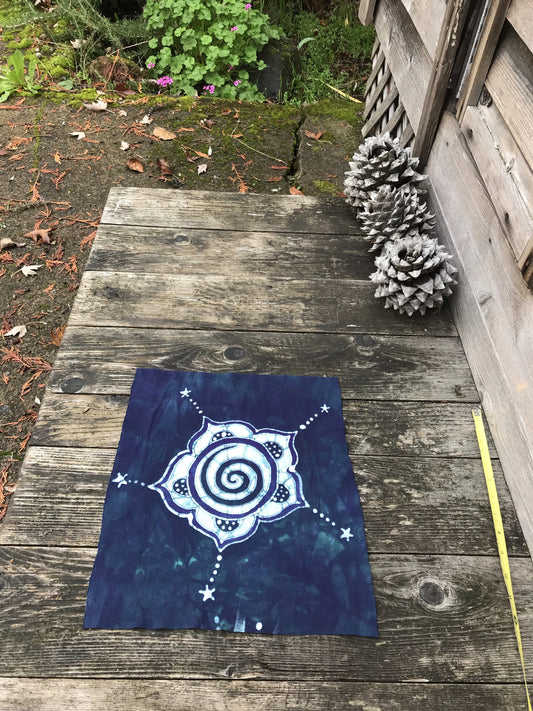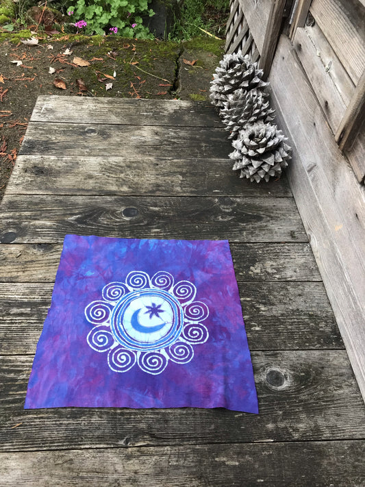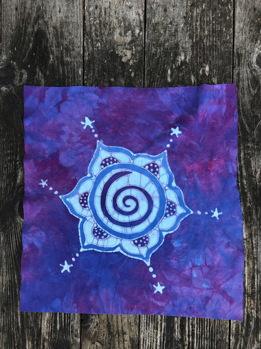 Hand Painted Batik Fabric Square - Swirling Star Flower in Teal and Purple