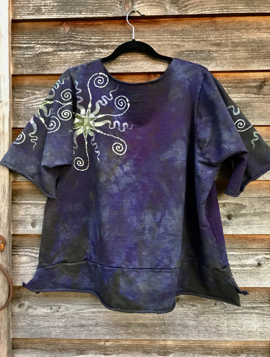 Teal Purple Moon Organic Cotton Handmade Batik Top, Size 2X Plus