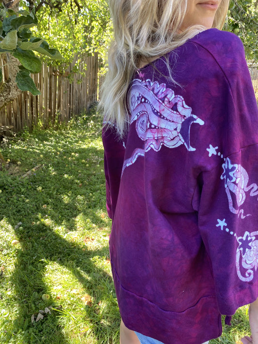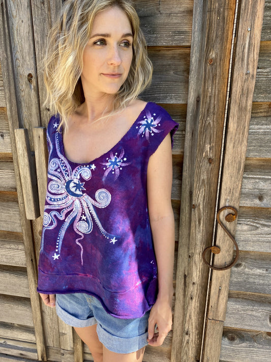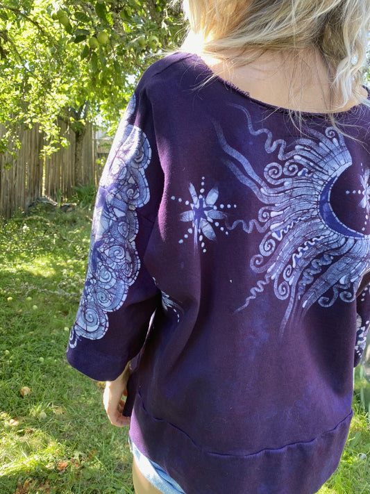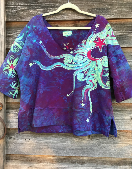 Lavendar Moon Glow Vneck Organic Cotton Handmade Batik Top, Size L/XL