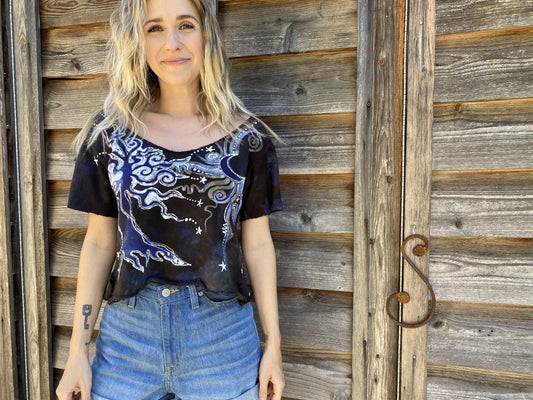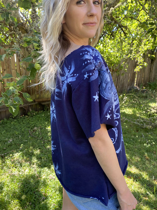 Midnight Blue Moon & Tree Organic Cotton Handmade Batik Top Medium/Large