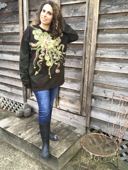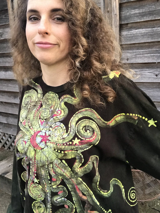 Jellyfish Moon in Dark Chocolate Handmade Batik Long Sleeve Tshirt - Size XL
