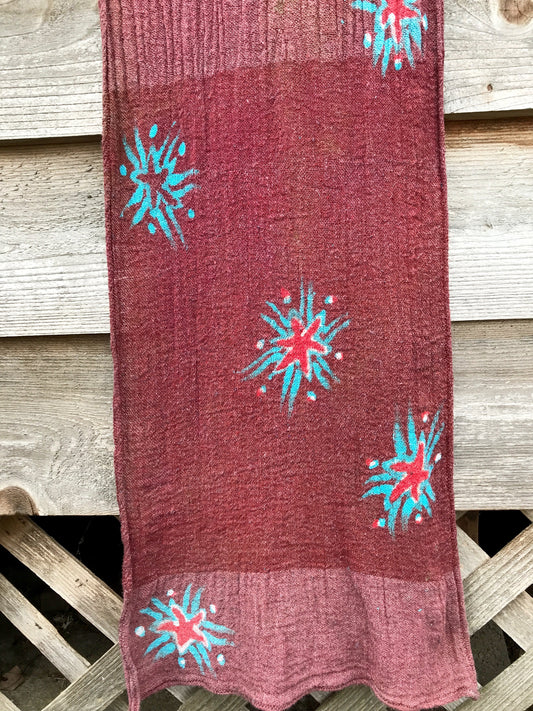 Dark Red Sun and Turquoise Stars Handmade Batik Scarf in Organic Cotton - Longer Length
