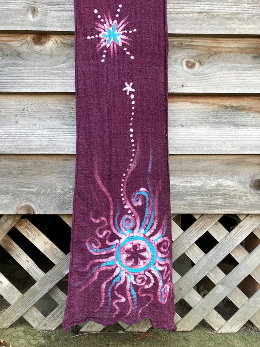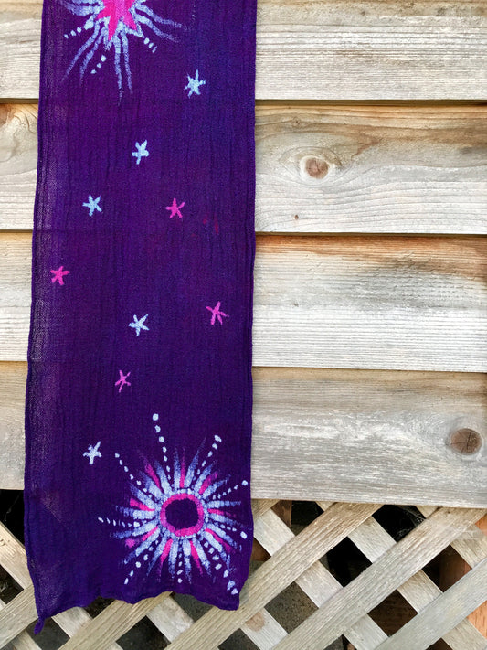 Purple Moon and Stars Handmade Batik Scarf in Organic Cotton - Longer Length