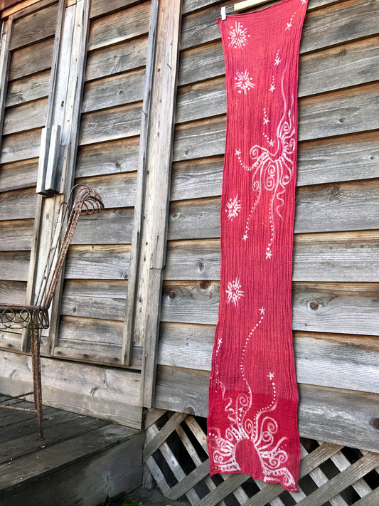 Light Red Sun Stars Handmade Batik Scarf in Organic Cotton - Longer Length
