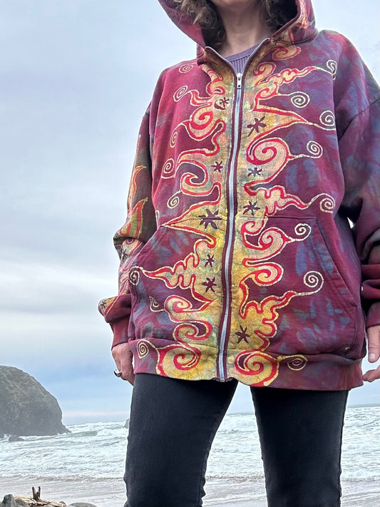 Driftwood Bonfire Swirls Handcrafted Batik Zipper Hoodie - Unisex Size Large