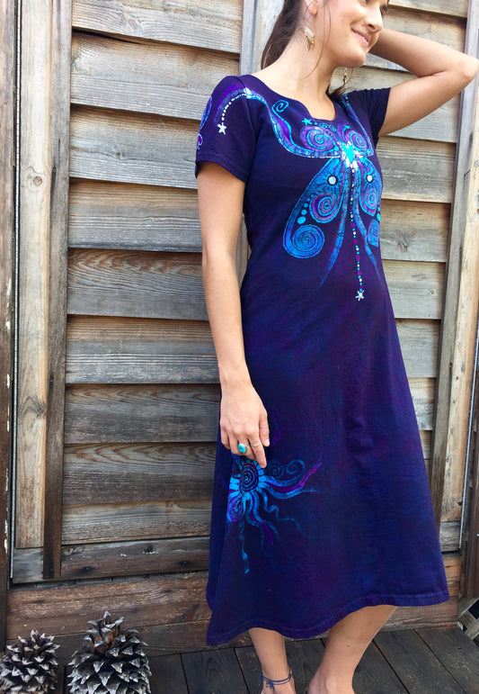 Deep Blue and Purple Moon Burst - Short Sleeve Batik Dress