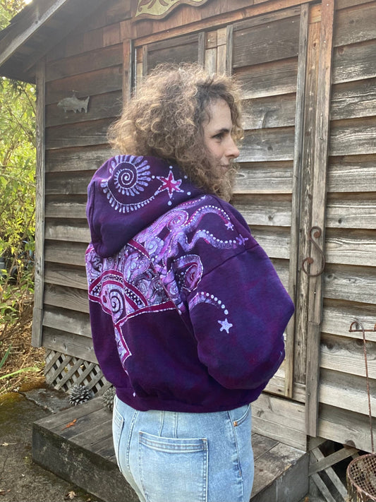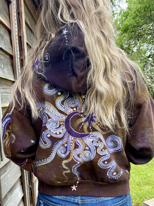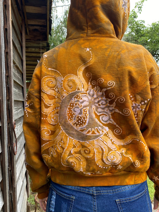 Dark Gold and Purple Moon and Stars Handmade Batik Hoodie - size M/L