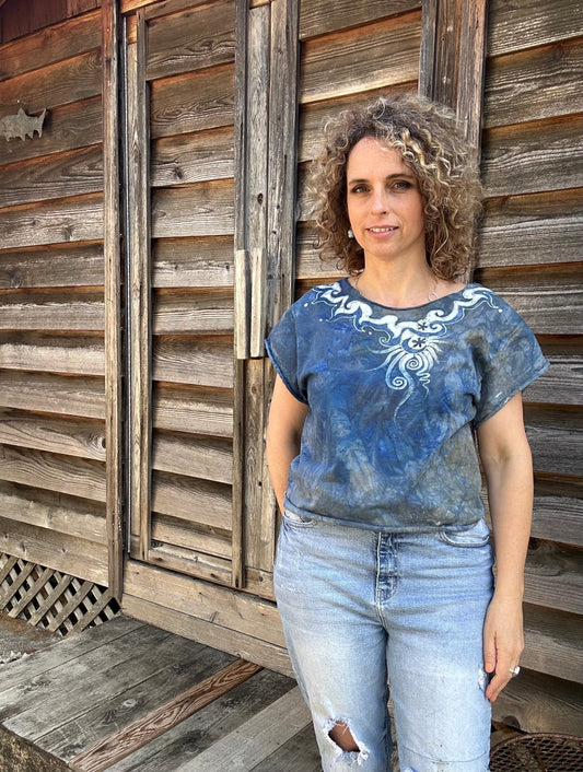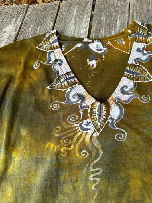 Golden Leaves & Moonlight – Handmade Batik V-Neck T-Shirt in Ochre Steel (2X Only)
