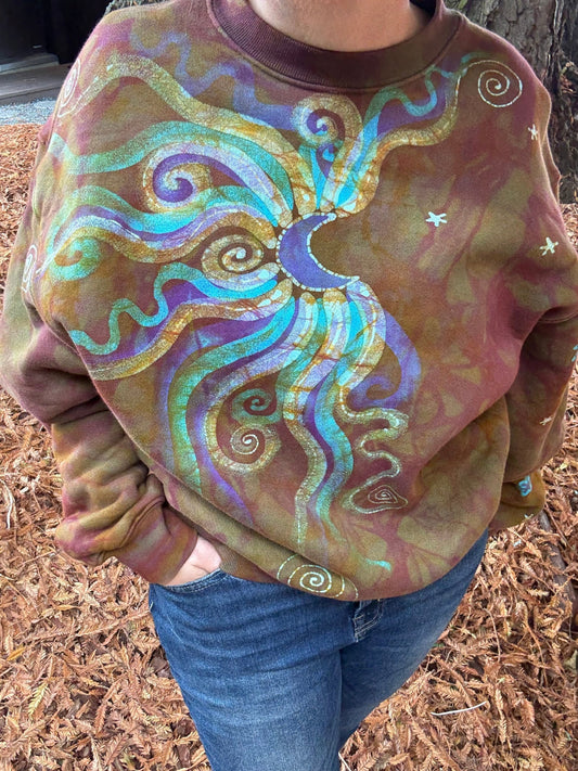 Celestial Cedar Puffy Batik Crewneck – Hand-Painted Copper, Turquoise & Purple Sweatshirt
