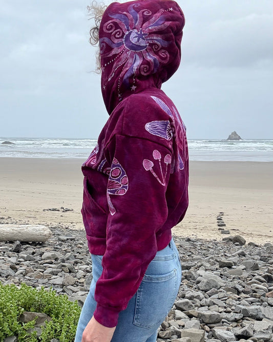 Berry Bright Mushroom Swirl Hoodie – Handcrafted Batik Zip-Up in Hot Pink & Purple