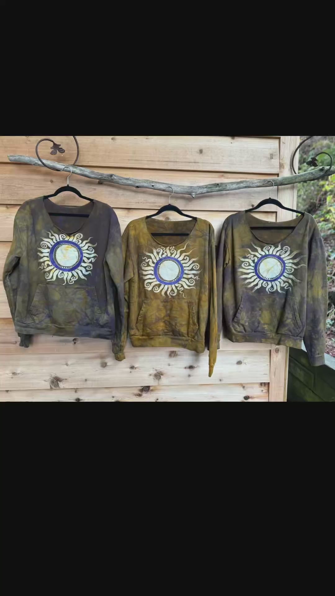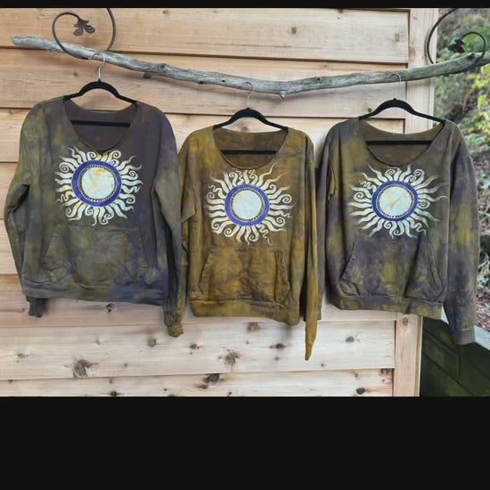 Super soft oversized long sleeve sweatshirt in an unusual dark gold color. Details with a purple undertone, the front features a full sun mandala with a true batik crackle effect.