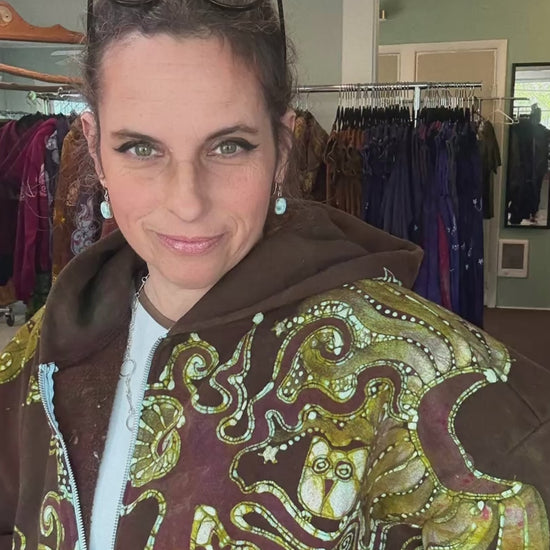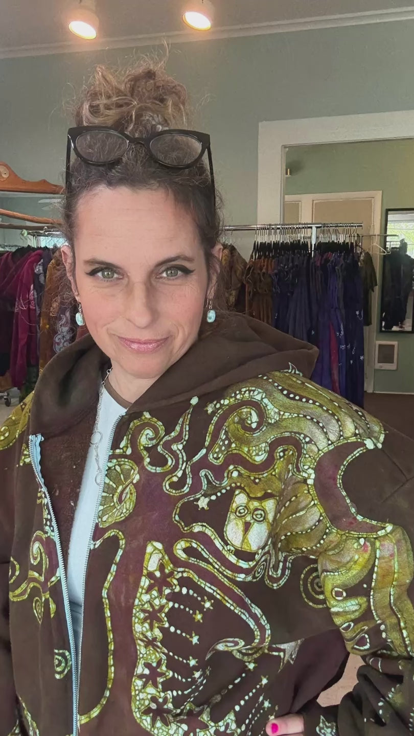 The artwork is painted freehand with molten wax, then dyed in stages using traditional batik techniques. After dyeing, the hoodie is boiled to remove the wax, revealing the full depth of color and detail in the design. Each one is signed and dated inside.