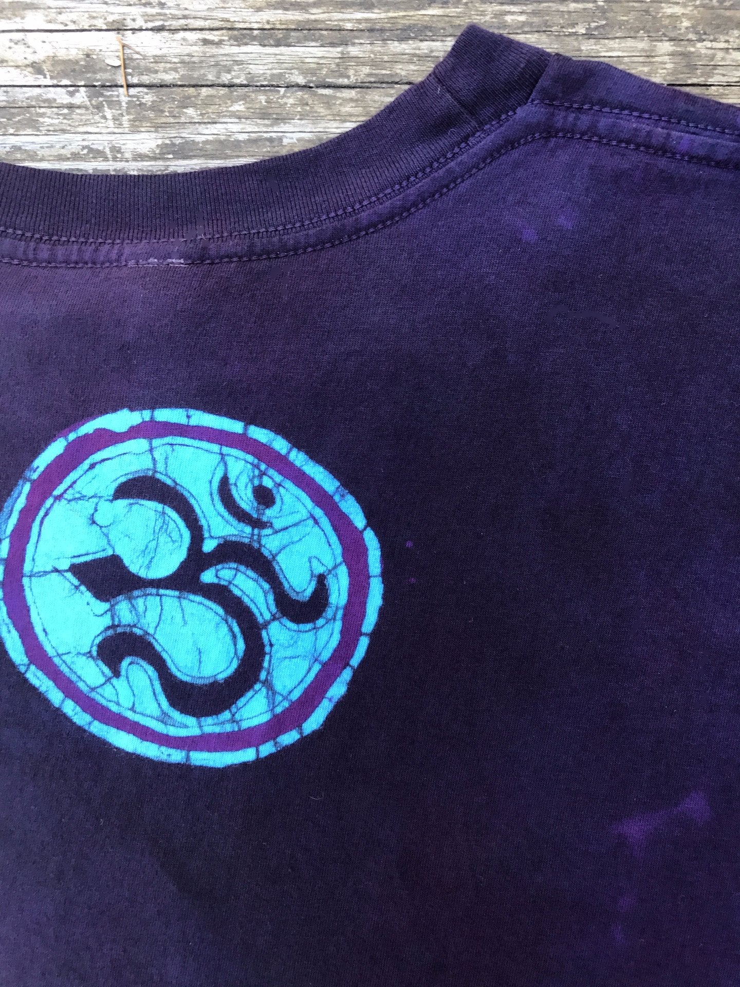 These batik colors begin with a turquoise base, then hand dyed into a deep magenta, and finally immersed into a midnight blue before being boiled clean of the beeswax.