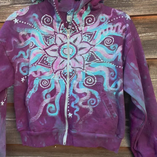 Bring a breath of the Pacific into your everyday with this hand-painted batik hoodie, featuring a radiant lotus flower surrounded by flowing turquoise waves and ocean-inspired swirls. Set against a rich berry-plum base, this original design evokes the feeling of a peaceful coastal evening — all captured in wearable art.