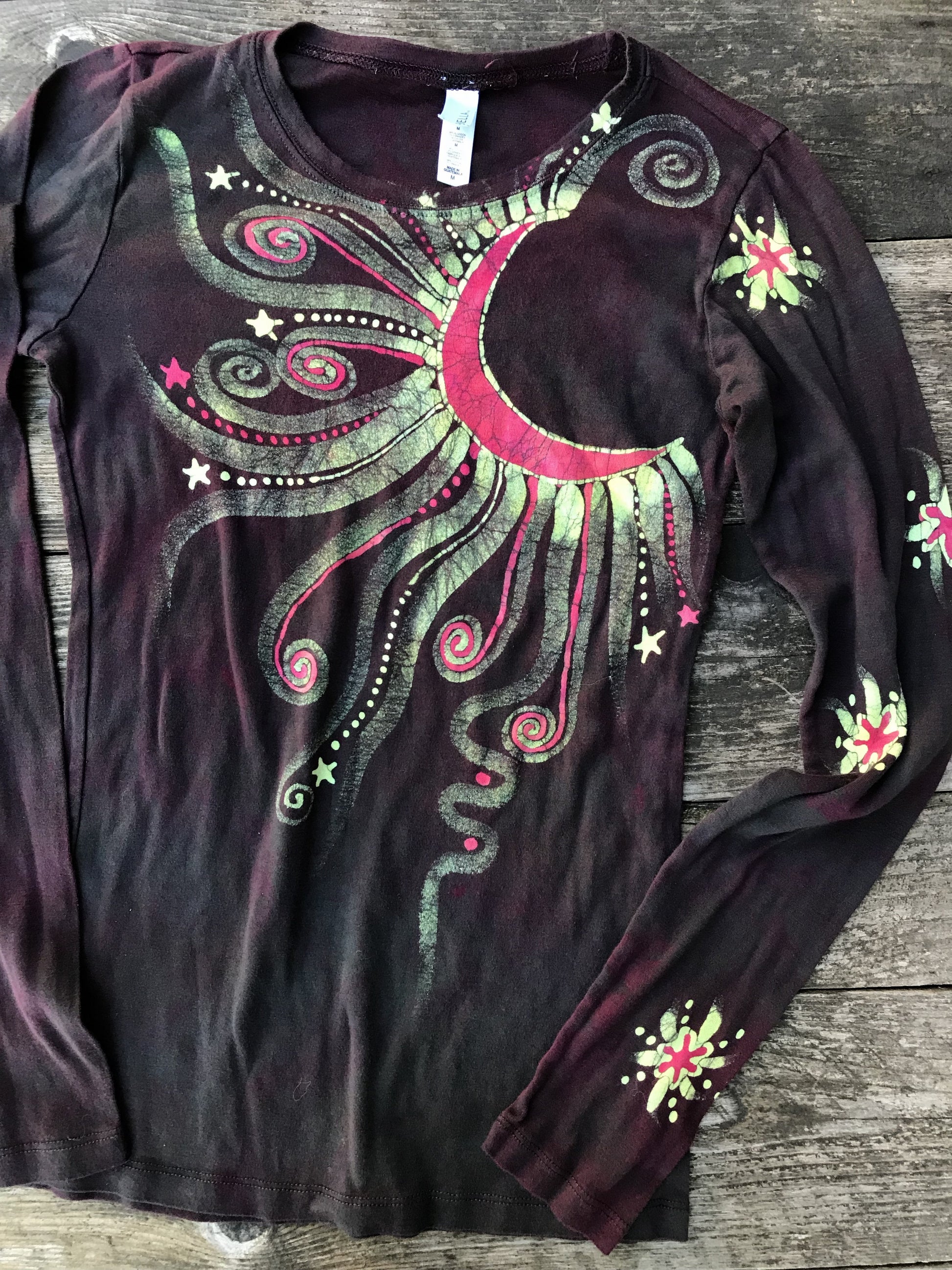 A mysterious (and somewhat controversial) forest green blankets a sparkling combination of pastel yellow and Portland pink in this hand painted batik top.
