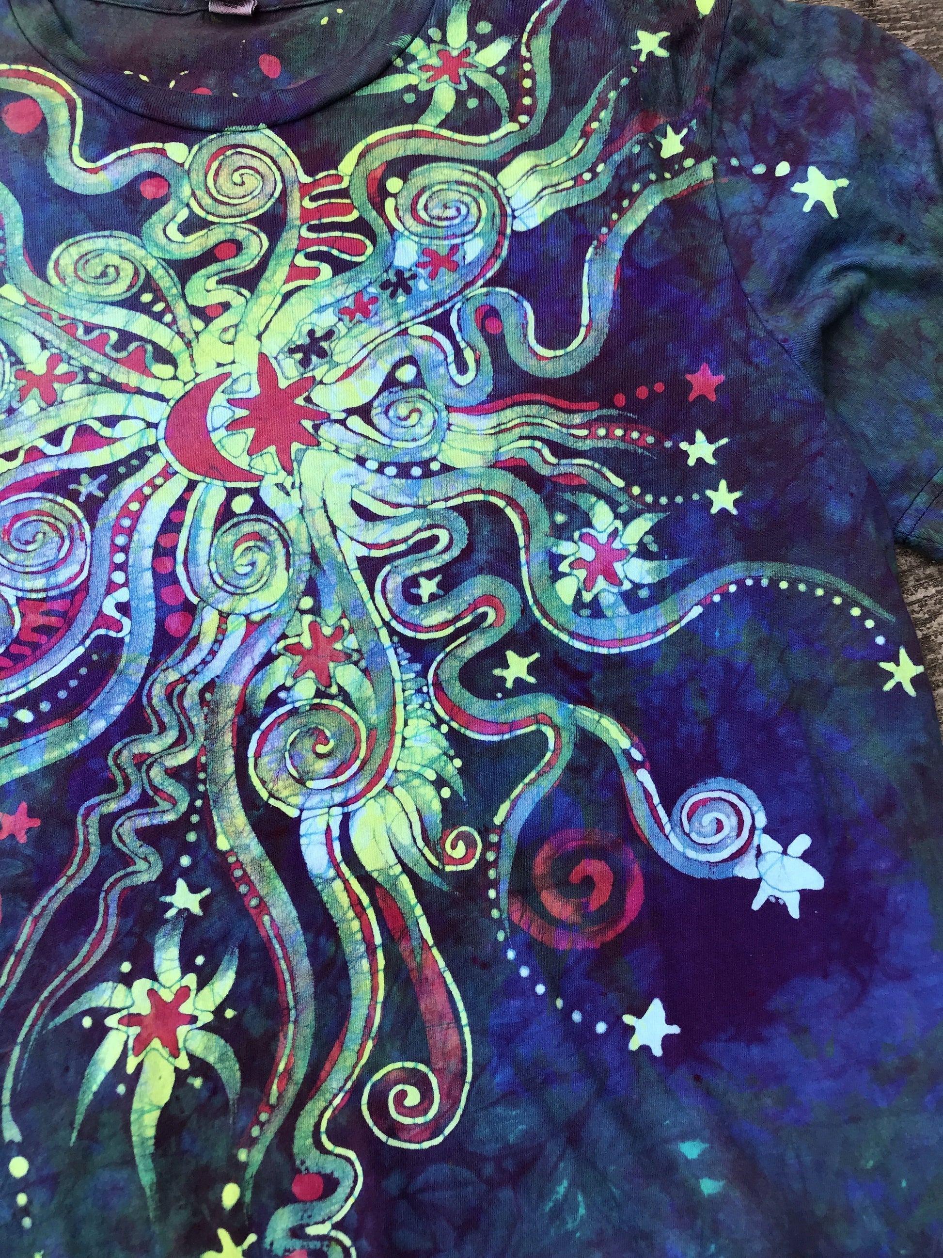 This is a triple layer overdyed batik tshirt, with light yellow, fuchsia and a strong turquoise - in that order. Each detail was hand painted with pure beeswax between dye baths. The beeswax is removed by boiling the tshirt in a cauldron of water.