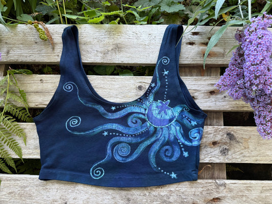 Reversible Batik Sports Bra – Navy Celestial Sun & Moon Crop Top in Teal & Purple